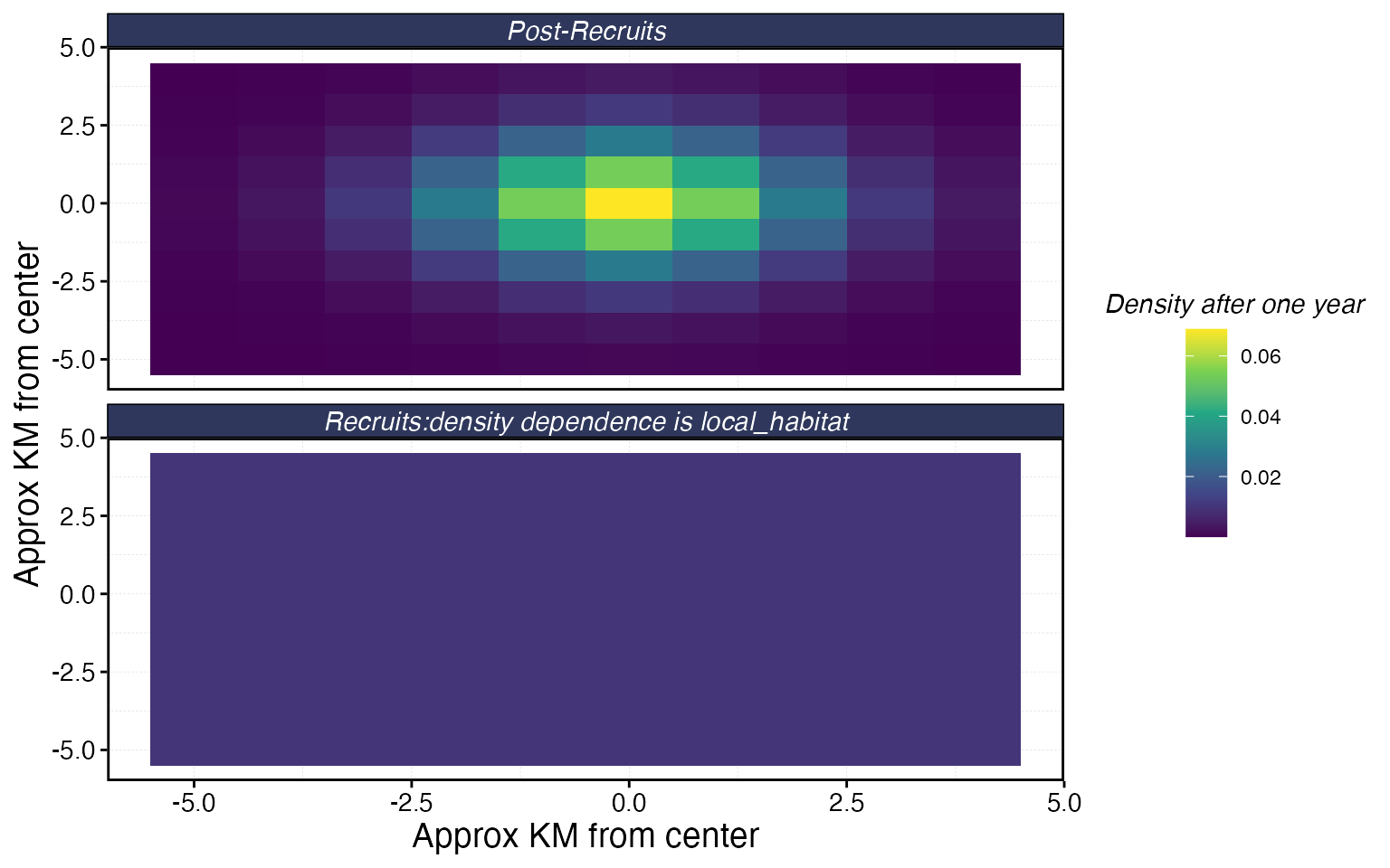 density_dependence: how recruitment relates to space —"global_habitat"means recruits settle across the whole domain weighted by habitat,"local_habitat"means they stay near where they were spawned