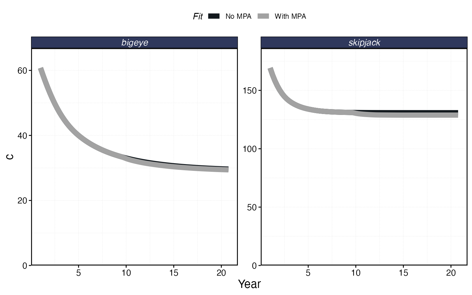 proc_mpa <- process_marlin(sim_mpa, time_step = time_step)plot_marlin can overlay multiple simulation results for